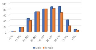 The age of the patients ranged from 12 to 80 years, with most cases occurring in individuals aged 41-70 years. Males constituted approximately 54% of the study population (Figure1).