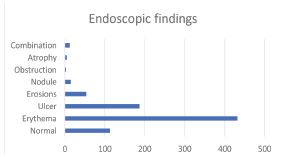 Among endoscopic findings, erythema was the most common observation (52.6%), followed by ulcers (22.8%) and erosions (6.6%). Approximately 13.8% of cases showed no detectable mucosal changes on endoscopy (Figure 2). The clinical presentations were correlated with endoscopic findings, and the association was found to be statistically significant (P <0.0001) (Table 1).